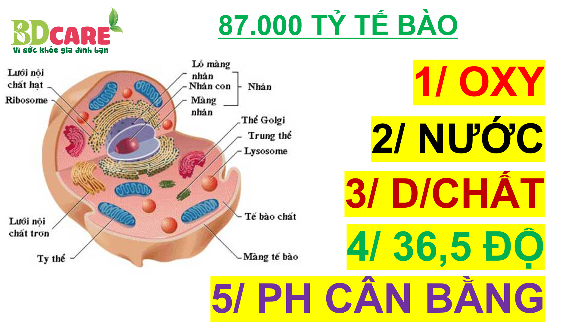 Theo giải Nobel 1931 của Otto Heinrich Warbug và các nghiên cứu khoa học trên toàn cầu đã chỉ ra rằng, cơ thể chúng ta được cấu tạo nên bởi khoảng 87.000 tỷ tế bào, mỗi tế bào hoạt động như 1 nhà máy mà nó cần 5 yếu tố chính để hoạt động nhịp nhàng, khỏe mạnh, tươi mới mỗi ngày đó là oxy, nước, dưỡng chất, môi trường PH và nhiệt độ 36,5